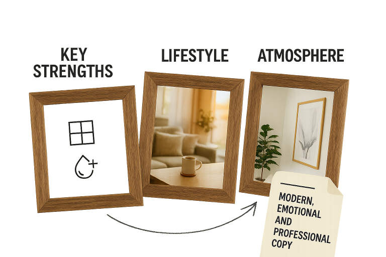 Create descriptions that highlight key strengths, lifestyle, and atmosphere. Modern, emotional, and professional copy.